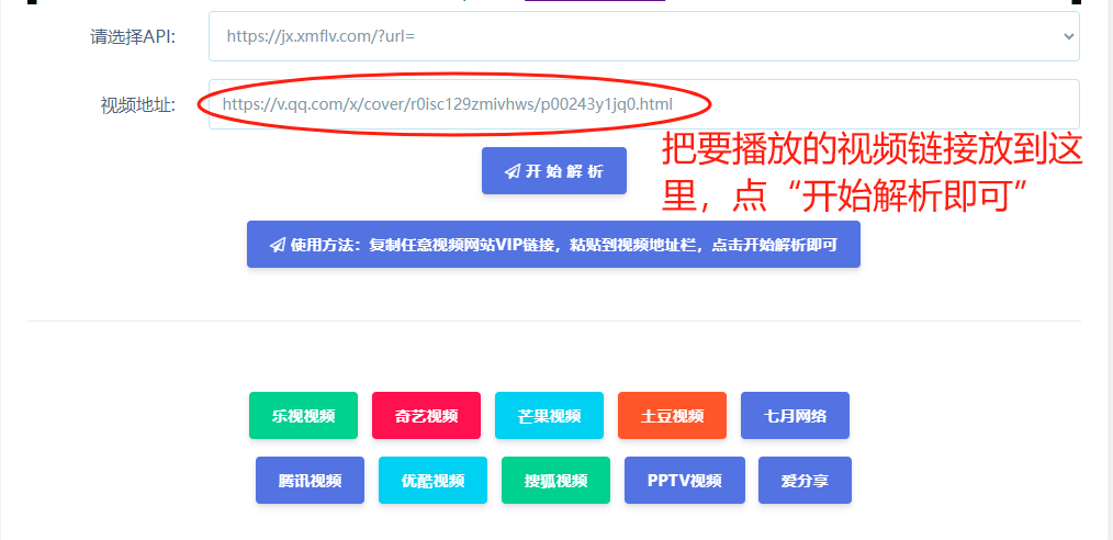使用方法:复制任意视频网站VIP链接,粘贴到视频地址栏,点击开始解析即可